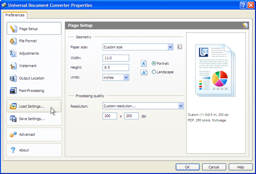 A3: Please open the Output tab in the Universal Document Converter Properties window. Select Append all pages to existing PDF file in Options drop down in bottom part of the window.